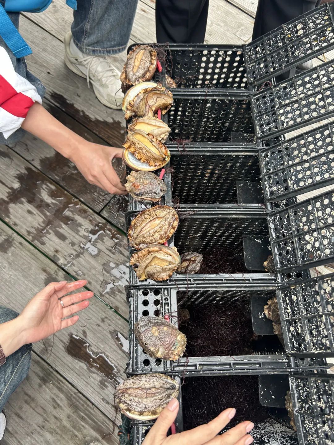 放眼望去,海洋牧場無邊無際,工人們正在嫻熟地往籠子里投喂鮮嫩的龍須菜和海帶。在灃運鮑業(yè)活鮑負(fù)責(zé)人黃總細(xì)致的講解及帶領(lǐng)下,考察團(tuán)成員們親身來到了鮑魚的海上養(yǎng)殖平臺,目睹了鮑魚寶寶的生長環(huán)境;學(xué)習(xí)了如何分辨鮑魚公母、身體結(jié)構(gòu)、養(yǎng)殖等小知識,并現(xiàn)場感受到了鮑魚滿滿的活力。